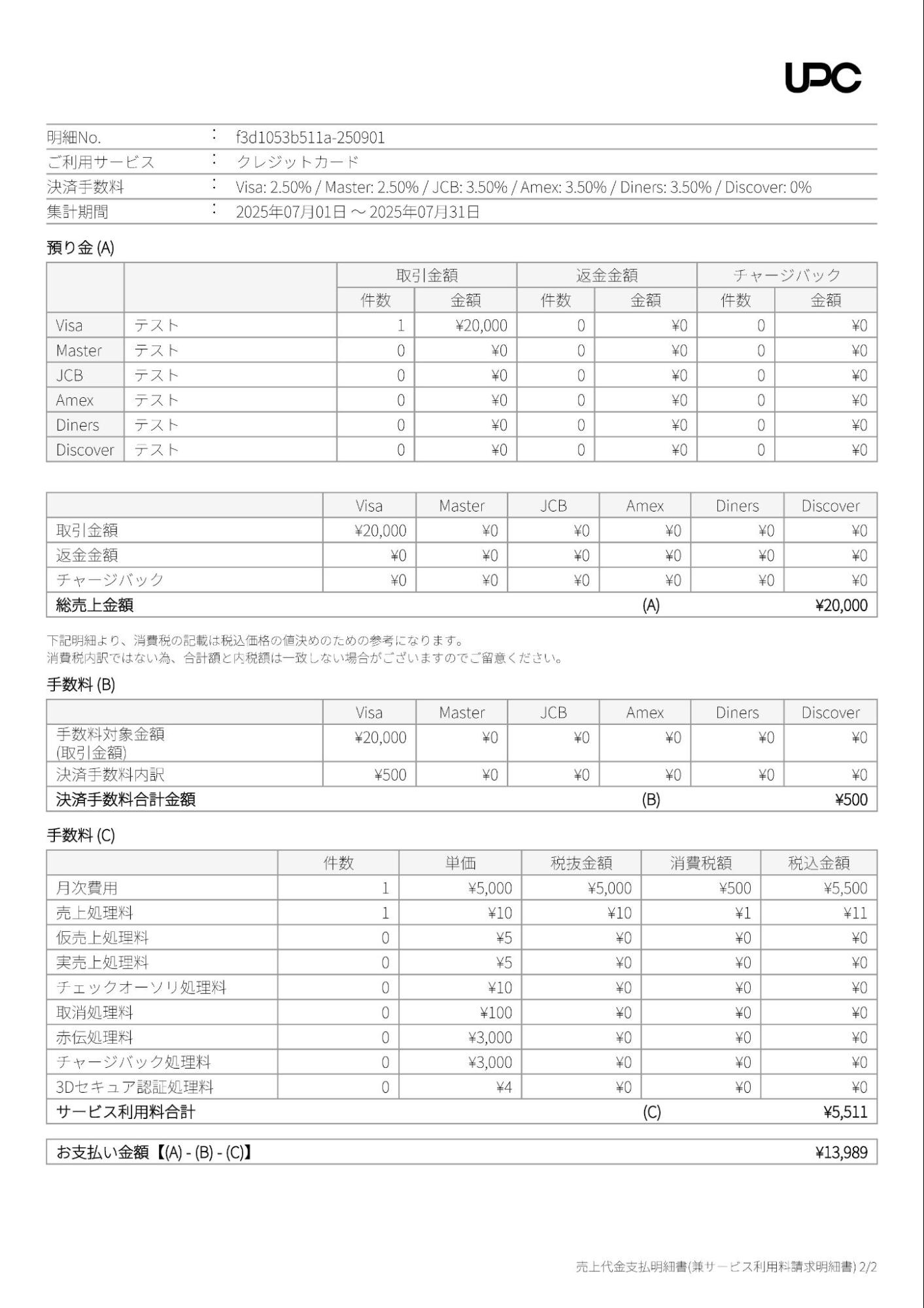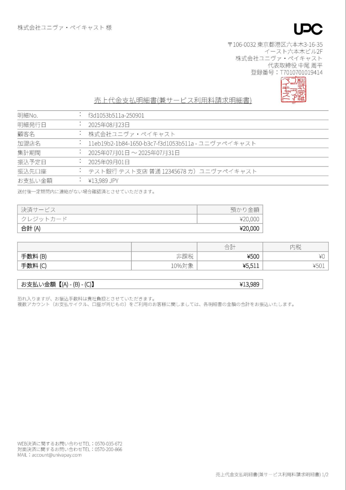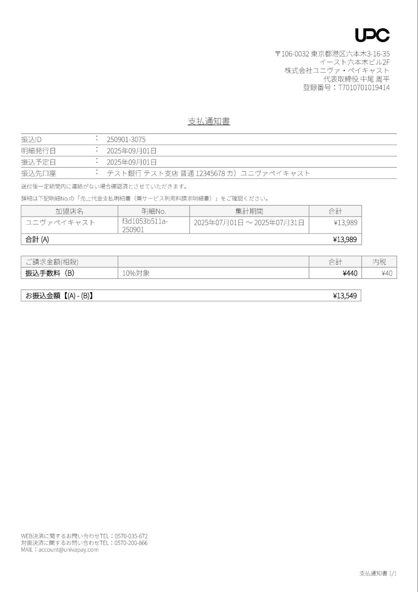 精算の結果、振込対象となった加盟店様に発行される書類です。