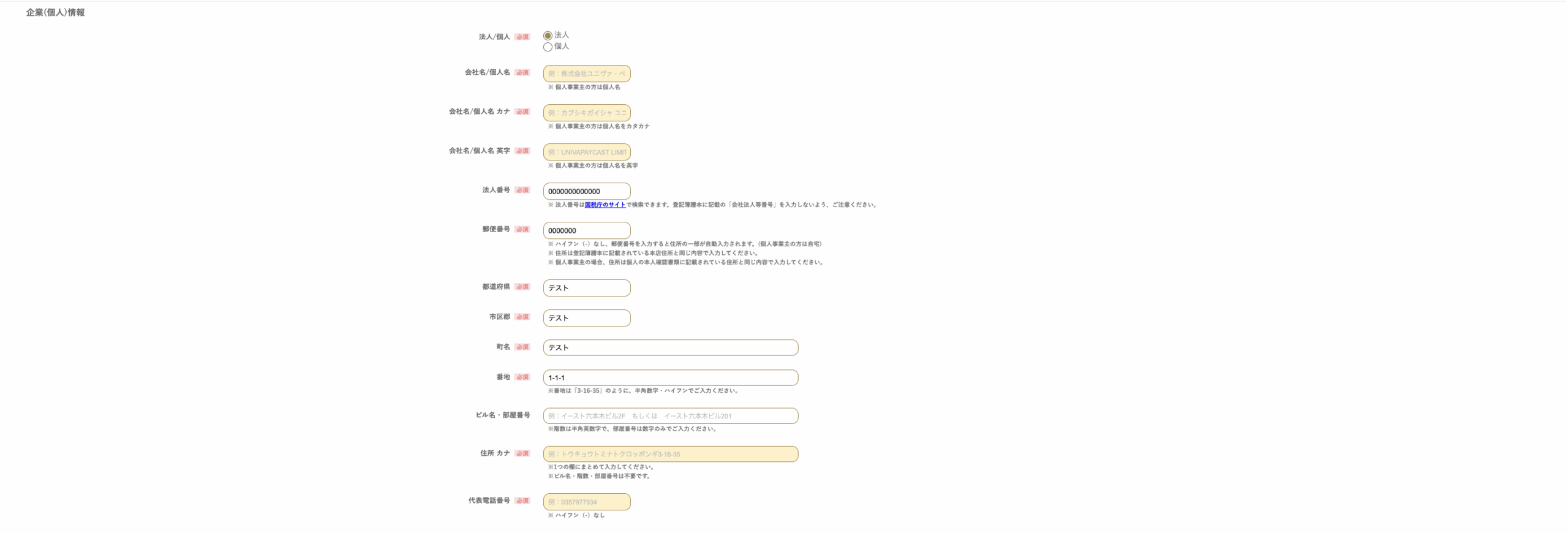 会社名/個人名 必須 | 株式会社ユニヴァ・ペイキャスト | 山田 太郎 |