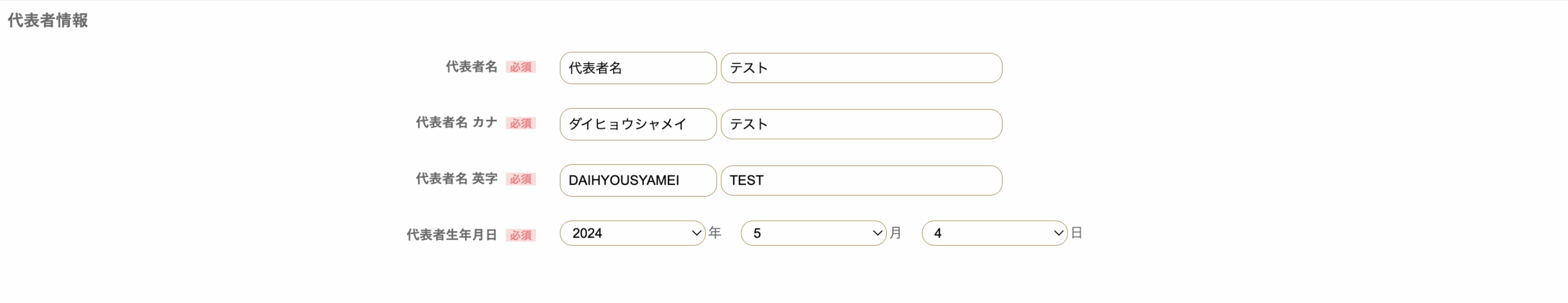 代表者名 カナ 必須 | テスト タロウ | ヤマダ タロウ | |
