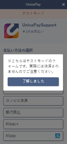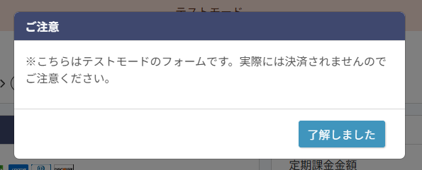 各決済フォームにおいて、テストモードの表示がされるようになりました!